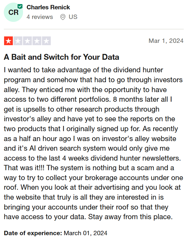 If you check Investors Alley on Trustpilot, it looks like it's bad news. The publisher has 2.7 stars out of 5 as of this writing. 75% of the ratings are one-star, and 25% are four-star ratings.