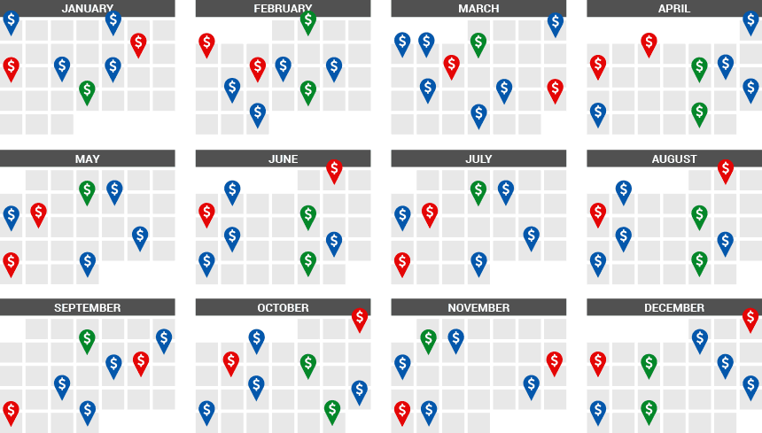 This calendar supposedly helps you build wealth quickly and reliably. Every green marker on the calendar supposedly shows you when money will be deposited into your account.